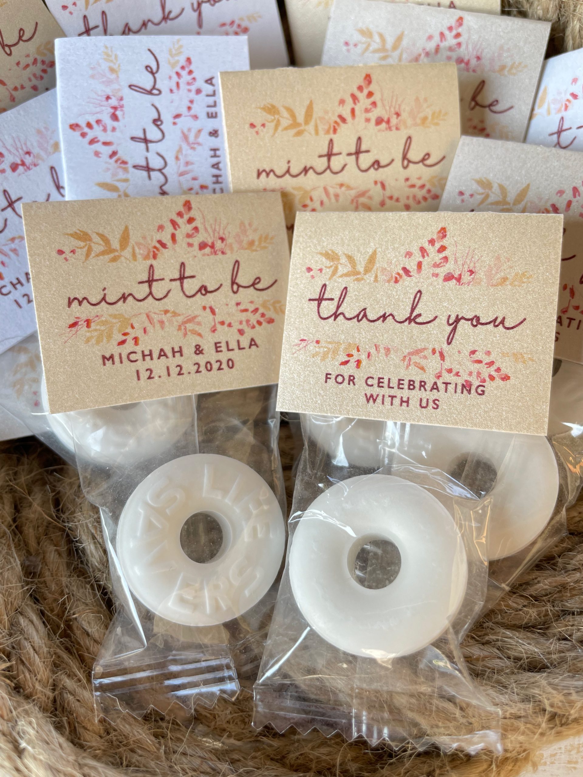 Wedding Favors Mint To Be – Fall Color Scheme – This season’s MUST-HAVE! The absolute classy touch you need at your engagement party, wedding reception, bridal shower, anniversary event or customize for a Save The Date. Printed on high quality shimmery, pearl-white cardstock – additional choices in drop down menu. Genuine Lifesaver® mints come fully assembled with your custom text and are made with quality card stock—pearly white with beautiful greenery design. Detail your party by using these on your guest tables, buffet table or send off table.